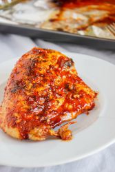 Из томатной пасты или кетчупа и специй сооружаем пикантный соус, которым нужно хорошенько натереть подготовленное заранее мясо, а остаток пролить сверху на куриные грудки, уложенные в соответствующую посудину для выпечки. Саму емкость, подходящую по размерам, предварительно натираем постным маслом.