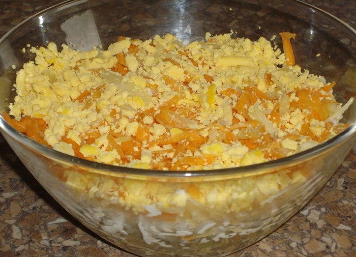 6. Затем идет в салат слой тертых яиц на мелкой терке. Слой майонеза.