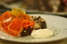 Выложите рыбу с грибами на порционную тарелку, сверху положите крабовое мясо и полейте все томатным соусом.